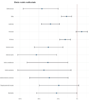 Para simplificar la interpretación de los resultados, en este apartado se hace referencia a las variaciones en cada caso por medio de los efectos relativos acumulados multivariados, esto por las siguientes razones: primero, porque es más ilustrativo ver el impacto agregado que generaron las medidas, pues este da cuenta de la variación antes y después de la medida con respecto al comportamiento proyectado para los 41 días posteriores a la implementación de la medida; segundo, porque permite evidenciar el impacto del ASPO en relación con el volumen de datos de cada delito en comparación con el mismo delito y no entre delitos que pueden reportar cifras muy disimiles, y, tercero, porque las variables de control le dan mayor confianza y significancia estadística sobre los resultados.