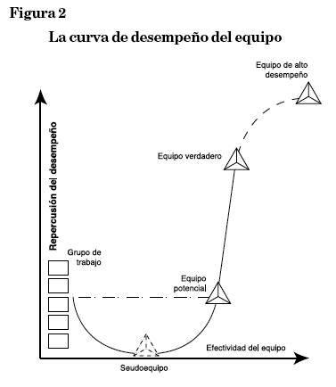 La curva de desempeño del equipo (ver Figura 2) describe la forma como opera cualquier grupo pequeño. A diferencia de los equipos, los grupos de trabajo dependen de la suma de los mejores individuos para su desempeño. No buscan productos de trabajo colectivo que requieran un esfuerzo conjunto. Al seleccionar la vía del equipo en lugar del grupo de trabajo, las personas se comprometen a correr riesgos de conflicto, de productos de trabajo conjunto y de acción colectiva, necesarios para crear un propósito común, un conjunto de metas, una propuesta y una responsabilidad mutua. Aquellos que se llaman a sí mismos equipos, pero que no corren estos riesgos son, cuando mucho, seudoequipos.