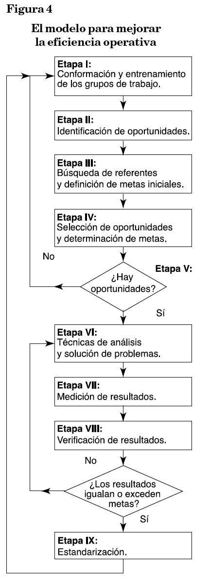 El modelo que se propone para mejorar la eficiencia operativa se muestra en forma esquemática (Figura 4). Este modelo comprende el desarrollo de varias etapas que deben planearse cuidadosamente: