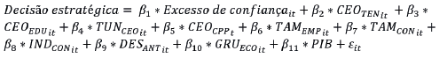 Para alcançar o objetivo proposto, a presente pes-quisa relacionou seis dimensões estratégicas (In-tensidade Publicitária, Intensidade de Pesquisa & Desenvolvimento, Investimento de Ativos Fixos, Es-trutura de Gastos, Gestão de Capital de Giro e Ciclo de Capital e Estrutura de Capital) ao Excesso de Confian-ça dos gestores utilizando diferentes metodologias de mensuração, de modo a expurgar as correlações espúrias.