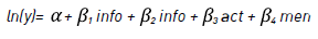 Donde ln(y) corresponde al logaritmo natural de la variable dependiente, la cual puede asumir una de tres formas: número de comentarios, reacciones y contenido compartido; α es el término constante; info, la categoría de contenido informativo; ent representa la categoría de entretenimiento; act es la categoría de contenido de acción y, finalmente, men representa la categoría mención. Estas variables independientes también son de naturaleza discreta y se operacionalizaron con uno (1), cuando estaban presentes, y con cero (0), cuando estaban ausentes.