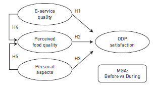 Nevertheless, studies about online food delivery providers are recent and scarce in marketing literature. Researchers have focused on the attitudes towards it (Cho, Bonn & Li, 2019; Yeo, Goh & Rezaei, 2017), intention to use (Alagoz & Hekimoglu, 2012; Okumus, Ali, Bilgihan & Ozturk, 2018; Yeo et al., 2017), adoption of ODPs (Okumus & Bilgihan, 2014), and final conversion (i.e., placing an online order) (Kapoor & Vij, 2018). All these studies analyse the pre-consumption stage. Instead, this work investigates customers who have already adopted the use of ODPs, have placed orders and have eaten the food, and analyses their satisfaction with the ODP. In this regard, Wang, Tseng, Wang, Shih and Chan (2019) studied satisfaction only with restaurant-owned apps, and the authors included mainly information systems (IS) variables as determinants. Alalwan (2020) included detailed functional aspects as precursors of ODP satisfaction. Suhartanto et al. (2019) proposed e-service quality and food quality as determinants of e-satisfaction. Macias et al. (2020) added personal aspects of delivery workers in the ODP context and explored spillover effects over restaurant brands. The present work differs from Macias et al. (2020) since this study analyses changes in the evaluation of e-satisfaction and its determinants, and changes in the structural relationship due to the COVID-19 lockdown, using a larger sample to capture the effect of the health emergency period. In addition, we provide a qualitative analysis of customer perceptions about the service of ODPs in times of COVID-19, which could bring new insights for further research on this topic.