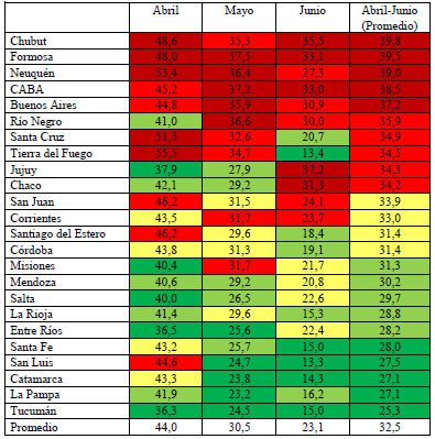 Figura 1 IAET a nivel provincial - valores mensuales (ordenados por promedio abril-junio)