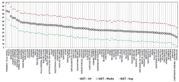 Para el caso de las principales 85 AEL del país, la figura 3 muestra el valor inferior y superior del IAET, promedio abril-junio, y la media de ambos. En un sencillo análisis de robustez, se verifica que los principales resultados en los extremos de la distribución se mantienen incluso al acercar el nivel de operatividad sectorial a su hipótesis de máxima para las AEL más afectadas y llevar la hipótesis de operatividad al mínimo para las AEL menos afectadas. El IAET-Inferior para las cinco AEL más afectadas es en promedio de 36, mientras que el IAET-Superior para las cinco AEL menos afectadas es en promedio de 33.