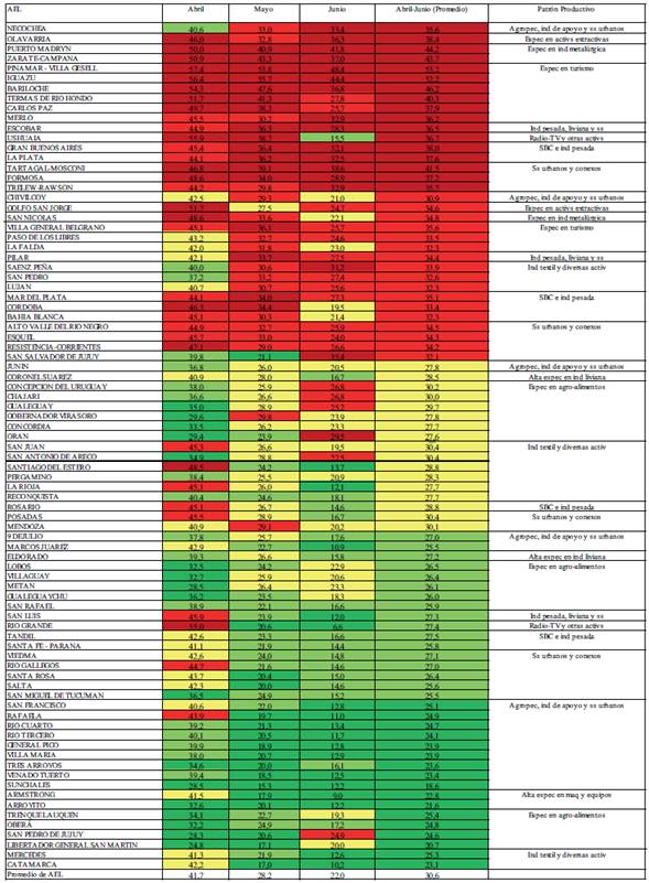 Al margen de esta mayor variabilidad en el centro de la figura 6, las posiciones relativas de las AEL en los extremos tienden a ser más estables, algo que ya podía percibirse en la figura 4. Por ejemplo, entre las 34 AEL más afectadas según el promedio del trimestre (los dos tonos de rojo), únicamente Necochea, en abril, y Ushuaia, en junio, se ubicaron momentáneamente en el otro extremo de la distribución (los verdes).