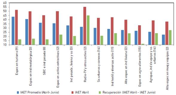 En la figura 7 se muestran los resultados agregados a nivel de los diferentes patrones productivos sectoriales. Cada agregado surge de ponderar las distintas AEL que lo componen de acuerdo con su peso relativo en términos del total de empleo asalariado registrado en el sector privado. Los perfiles sectoriales más afectados en el promedio del trimestre son, en general, los más afectados también por las restricciones de carácter sectorial implementadas en el mes de abril, esto sumado a que varios de ellos exhiben además una muy baja recuperación económica entre abril y junio. El caso más atípico es el patrón sectorial de producción de aparatos de radio, televisión y comunicaciones, que abarca únicamente dos AEL muy específicas, Río Grande y Ushuaia en la provincia de Tierra del Fuego, que, como se ha visto antes, a pesar de haber sido de las más afectadas al inicio de la pandemia, lograron recuperarse fuertemente en los meses siguientes, sobre todo en junio. Dejando a un lado este caso particular, los patrones productivos más afectados por la pandemia y el aislamiento son aquellos vinculados al turismo, a algunas actividades extractivas y a diversas industrias pesadas que se vieron restringidas en su operación.