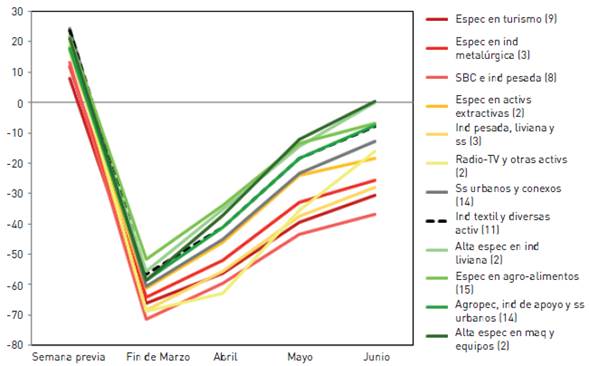 Notas: entre paréntesis figura la cantidad de AEL que presenta cada perfil productivo sectorial. Semana previa (a cualquier medida de política) comprende del 9 al 13 de marzo de 2020. Fin de marzo comprende los días laborables entre el 20 y el 30 (tras el comienzo del ASPO). Abril, mayo y junio comprenden todos los días laborables de estos meses.