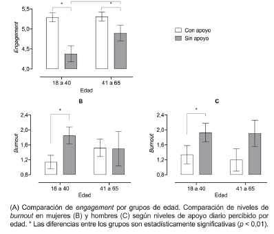 Desde una mirada más general, las prácticas de apoyo es la variable que mayor efecto tiene al momento de explicar el alto engagement o bajo nivel de burnout, lo que puede observarse en el análisis de las varianzas de ambas variables. Respecto al engagement, el apoyo tiene efectos distintos dependiendo de la edad de la persona que lo recibe; así, los resultados de esta investigación indican que las personas menores de 40 años que no reciben apoyo diario presentan menores niveles de engagement. Respecto al burnout, las interacciones indican diferencias, para el caso de las mujeres, con los puntajes más bajos en mujeres entre 18 y 40 años que reciben apoyo, en comparación con aquellas mujeres de la misma edad que no reciben apoyo diario. Para el caso de los hombres, independiente de la edad, quienes reciben apoyo tienen puntajes significativa mente más bajos que quienes no lo reciben.