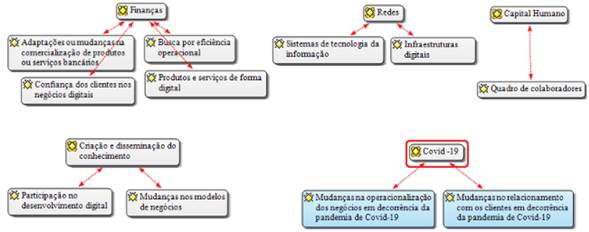 Destaque deve ser dado aos elementos que surgiram do estudo empírico. A pandemia de Sars-Cov, que avançou especialmente a partir de março de 2020, deu origem a um novo grupo de recursos chamado COVID-19. No processo de adaptação às condições da pandemia, os clientes das instituições bancárias que mantinham o relacionamento de forma presencial, principalmente as gerações com mais idade, tiveram que aceitar o uso da tecnologia (Navaneetha Krishnan, Venkateswaran e Sathish, 2020). Com isso, os fatores, “mudanças no relacionamento com os clientes em decorrência da pandemia de COVID-19”, que já fazia parte do grupo de Finanças, e “mudanças na operacionalização dos negócios durante a pandemia de COVID-19”, que estava no grupo Criação e disseminação de conhecimento, foram realocados para o grupo de recursos COVID-19, por estarem diretamente relacionados à pandemia.