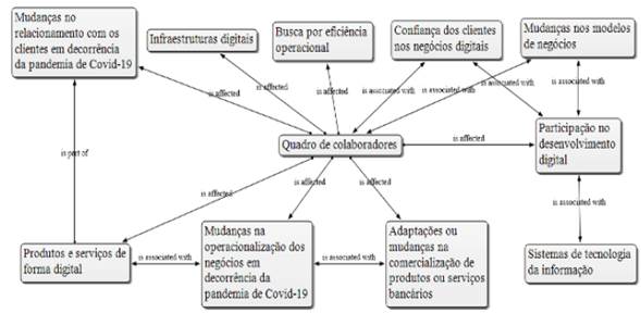 Com base nos resultados gerados pelo software Atlas TI, observou-se que os impactos da pandemia de COVID-19 ocorreram principalmente sobre o capital humano, visto que na Figura 2, o quadro de colaboradores está ligado com praticamente todos os outros fatores. Em publicação do site MoneyTimes, os executivos dos bancos Itaú Unibanco, Bradesco e Banco do Brasil, analisaram o panorama atual e o papel do setor bancário dentro do cenário atual, concluindo que, “diferentemente das crises anteriores, as instituições financeiras são uma parte determinante para combater os impactos da COVID-19 na economia e precisam atuar em conjunto com a esfera pública”.