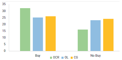 Further analysis included the ST that participants spent making shopping decisions. We assumed that more time spent meant that participants were reading and analyzing the recommendations; thus, we expected a high correlation with the consumer decisions to buy or not buy the product or service (Zichermann & Cunningham, 2011). Figure 1 shows that participants from the OCR group spent more time (M = 82 sec; SD = 4.5; N =48) in the consumer decision than the OL one (M = 61 sec; SD = 3.5; N =48) and the CG (M = 57.9; SD = 2.3; N = 50). Thus, participants followed the OCR recommendation more (75%) than the OL ones (25%).
