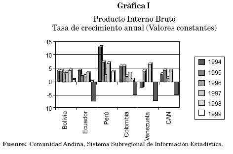 La tasa de crecimiento del PIB real ofrece un panorama global que revela no sólo la magnitud de la CAN como un importante mercado, sino también los éxitos compartidos en la reducción de la inflación e importantes crecimientos de su producto durante la década de los años noventa, a excepción de los años 1998-1999 donde la participación en el crecimiento fue negativa para los principales países miembros a causa de las crisis internas de cada uno de ellos, y profundizadas por los impactos de la crisis internacional que se desencadenó en Asia a mediados de 1997 que terminaron siendo, a la larga, mucho más profundos de lo que consideraron inicialmente todos los analistas. Como consecuencia la región andina como conjunto entró en recesión en el segundo semestre de 1998 y continuó en dicha situación durante todo 1999, alcanzando para este año un decrecimiento de su tasa del PIB del orden del -4.8%: donde Colombia "aportó" - 4,8%, Ecuador -7.3% y Venezuela - 7.2%. Sin embargo, las excepciones a esta tendencia fueron Perú y Bolivia, que experimentaron crecimientos moderados con tasas de 3.8% y 0.8% respectivamente2.