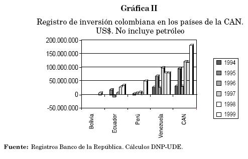 La inversión colombiana muestra un incremento sustancial desde 1995 hacia los países andinos dado por el desarrollo que éstos han tenido en la última década. Llama la atención señalar que Venezuela es el mayor perceptor de inversión colombiana, alcanzando en 1997 un máximo aproximado de 102 millones de dólares; seguido por Ecuador y Perú que en 1999 alcanzaron 39 y 53 millones de dólares respectivamente. Bolivia, por su parte, no ha representado en términos relativos un mercado muy atractivo para Colombia; sin embargo, en el año 1999 se invirtieron ocho millones de dólares, cifra muy alta comparada con la del año inmediatamente anterior que sólo alcanzó 158.000 dólares. Los anteriores resultados se resumen en la Gráfica II que, en términos generales, muestra la tendencia creciente de inversión colombiana en los países miembros de la CAN, alcanzando en conjunto un máximo aproximado de 182 millones de dólares en 1999. Es decir, que Colombia en sólo seis años ha incrementado sus niveles de inversión en aproximadamente 448% y sólo entre 1998 y 1999 la incrementó en aproximadamente 50%.