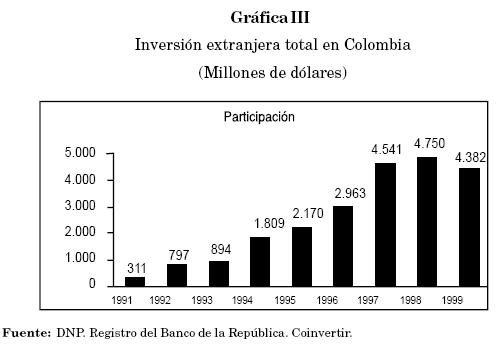 Sin embargo, el país ha venido enfrentando una difícil situación económica y de seguridad que ha repercutido en que las iniciativas de inversión en Colombia sean cada vez más estudiadas por las empresas foráneas. Si bien se vislumbra una recuperación en la ctividad económica del país, lo cierto es que debido a la incertidumbre política, la inestabilidad jurídica, la acción guerrillera y el recrudecimiento de la situación de violencia, la percepción de riesgo-país se ha incrementado entre los inversionistas extranjeros. De acuerdo con los registros del Banco de la República, la inversión extranjera directa alcanzó un total de US$4.382 millones en 1999, es decir, un 7.8 inferior al año anterior (Ver Gráfica III).