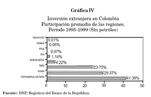 Mientras en 1995 Norteamérica representaba el 41% del total, para 1999 esta participación decreció hasta llegar al 23.8%. Por otro lado, los inversionistas provenientes de América Central y las Antillas pasaron del 26% en 1995 al 41% en 1999, desplazando a América del Norte como la región más representativa. Este fenómeno tuvo lugar debido a la canalización de capitales a través de los paraísos fiscales existentes, y a la afluencia de capital del narcotráfico hacia esta región. Europa también aumentó su participación, ocupando el segundo lugar con un significativo 29.4%. No así la región sudamericana (incluida la comunidad andina), que en 1995 alcanzó una participación del 12.3% para declinar hasta 4.22% en 1999 (Ver Gráfica IV). El comportamiento registrado por la IE a partir de 1997 no ha sido tan dinámico como aquel observado durante los seis primeros años de la década de los años noventa. Sin embargo se espera que con el esfuerzo que está haciendo el país por mejorar sus niveles de competitividad, junto con una actividad económica en vía de recuperación, y un proceso de paz en marcha, Colombia presente un crecimiento de las tasas de inversión similar al de mediados de la década pasada.