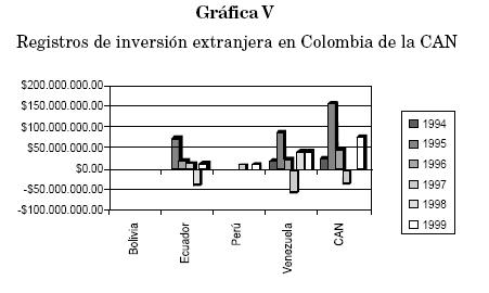 En cuanto al tema que nos ocupa, la CAN en términos de inversión extranjera en Colombia muestra unas fluctuaciones asimétricas que no permiten determinar una tendencia clara en su comportamiento. Por ejemplo (véase Gráfica, V), en el año 1995 la Comunidad Andina invirtió en Colombia cerca de 160 millones de dólares; mientras que en 1998 sólo alcanzó cinco millones de dólares; sin embargo, para el año 1999 la inversión creció a una tasa muy alta, alcanzando los 77 millones de dólares. Cabe anotar que Venezuela y Ecuador respectivamente son los mayores socios andinos que colocan sus flujos de capital en el país, de una forma tal que entre ambos llegan a representar el 95% del total de la IED y en portafolio. Por otra parte, Bolivia y Perú no juegan un papel muy representativo como países inversores aunque Perú en 1999 tuvo un repunte importante cercano a 16 millones de dólares, comparado con el año anterior donde este país afrontó una desinversión cercana a los 59.000 dólares.