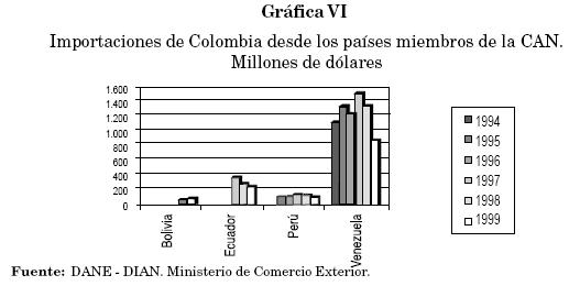 El comercio interregional durante la década de los años noventa ha sido particularmente dinámico, especialmente en lo que se refiere al comercio de manufacturas, en general se ha dado un proceso de apertura comercial en donde las importaciones colombianas de bienes se han incrementado en 4% del PIB en promedio desde los países andinos (Ver Gráfica VI)5. La marcada tendencia a la apertura de mercados en todos los países andinos verifica el abandono del modelo de sustitución de importaciones. Las industrias locales que pudieron sobrevivir lo han hecho volviéndose más eficientes y competitivas; provocando importantes reasignaciones de recursos al interior de cada economía.