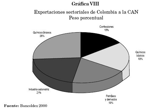 Con estas cifras se puede aseverar sin temor a equívocos que el comercio interandino ha cobrado una relevancia no esperada. En el caso específico de Colombia sus exportaciones sectoriales con el bloque andino se concentran en la comercialización de bienes como químicos livianos, industria automotriz, confecciones, entre otros, que se muestran en la Gráfica VIII con sus respectivos pesos porcentuales.