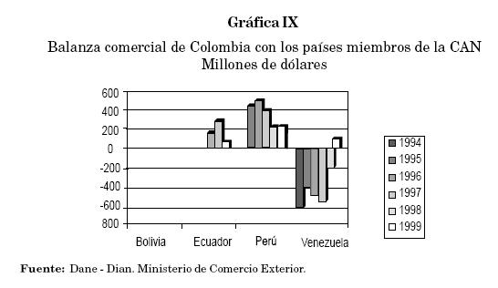 La apertura comercial colombiana con el bloque ha traído en los últimos años una reducción en el margen de cobertura de las exportaciones frente a las importaciones, es decir, un deterioro marcado en la balanza comercial pero aún siendo favorable en términos comerciales, salvo en el año 1999 donde Colombia alcanzó un superávit de aproximadamente 80 millones de dólares (Ver Gráfico IX)8.