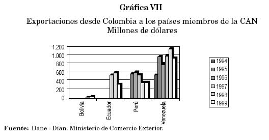 El otro efecto de la apertura es para las exportaciones, donde menores aranceles y restricciones a la importación de insumos y bienes de capital, eventualmente, deberán conducir al desarrollo de exportaciones no tradicionales. Efectivamente, analizando la evolución de las exportaciones de la CAN, se llega a la conclusión de que la mayor fuente de dinamismo de las mismas surge del comercio interandino y que en particular las exportaciones manufactureras al interior de la subregión han crecido a tasas muy elevadas. De esta manera, mientras las exportaciones interandinas en general han crecido a una tasa del 23% promedio anual, las exportaciones de manufacturas lo han hecho a una tasa anual del 27% entre el 90-976. Mientras que las exportaciones desde Colombia a la Comunidad Andina crecieron a una tasa inferior al 7% promedio anual en el período 94-99 (Ver Gráfica VII)7.