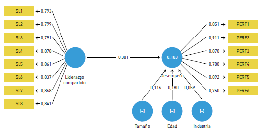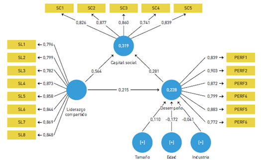Sin embargo, al incluir el efecto medidor del capital social entre el liderazgo compartido, se encuentra que la relación directa deja de ser significativa y afecta única-mente al desempeño organizacional por medio del capital social. Esta situación es similar a la que se presenta en otras investigaciones en las que se identifican variables con un efecto mediador total, como la coordinación, el compromiso con las metas y el conocimiento compartido (Han, Lee, Beyerlein y Kolb, 2018). Adicionalmente, cuando se tiene en cuenta el capital social, que se determina por los lazos e interacciones, se incluye la diversidad de los individuos y de los conocimientos y, para que el liderazgo compartido sea significativo en el desempeño organizacional, se debe contar con suficiente coordinación entre los miembros y la organización para minimizar las diversidades (Jabarzadeh, Sanoubar, Vahdat y Khosravi-Saghezchi, 2019). La falta de coordinación podría explicar este efecto no significativo.