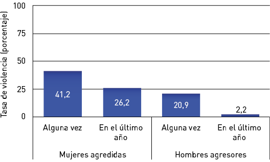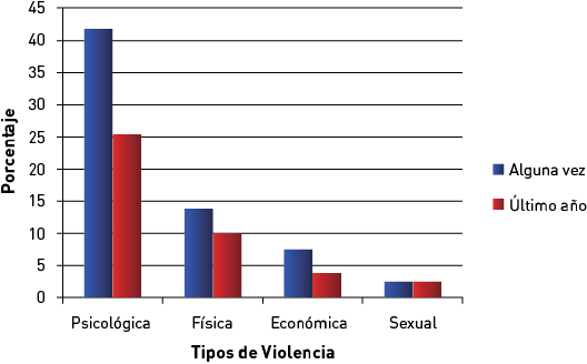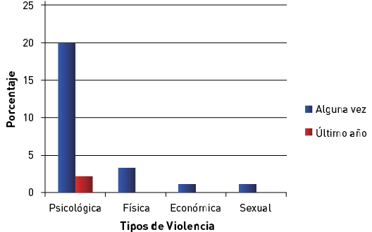 En cuanto a los tipos de VcM, se puede observar que la más frecuente es la violencia psicológica, cuyos da-ños suelen estar encubiertos. En orden de prevalencia, le siguen la violencia física, la económica y la sexual. En la figura 2 se observa este porcentaje según su ocurrencia: alguna vez en la vida y durante el último año. Considerando este mismo margen de tiempo, la figura 3 presenta el tipo de violencia ejercido por los hombres.