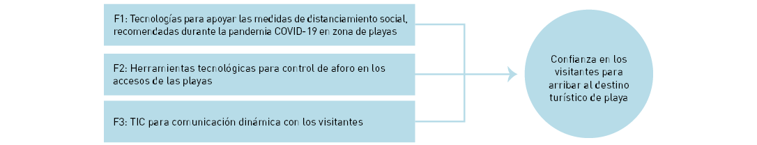 Se utiliza además el método cuantitativo para obtener, con la aplicación de un cuestionario a través de internet, la opinión del visitante regional (Tijuana, Mexicali, Ensenada y Tecate, Baja California y del sur de California, EE. UU.) acerca de la necesidad del uso de tecnologías aplicadas durante la pandemia COVID-19 para mejorar los resultados de las medidas de distanciamiento social en las playas: control del aforo en los diferentes accesos a la playa y TIC para interactuar con las personas que deciden arribar al destino turístico, pues necesitan información eficaz y dinámica. En los resultados, mediante análisis factorial, se obtuvieron los componentes tecnológicos que con-tribuyen a la motivación del visitante para mejorar su confianza de arribar a las playas del municipio de Playas de Rosarito, Baja California.