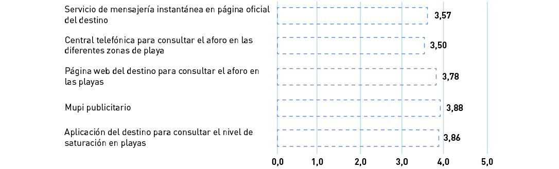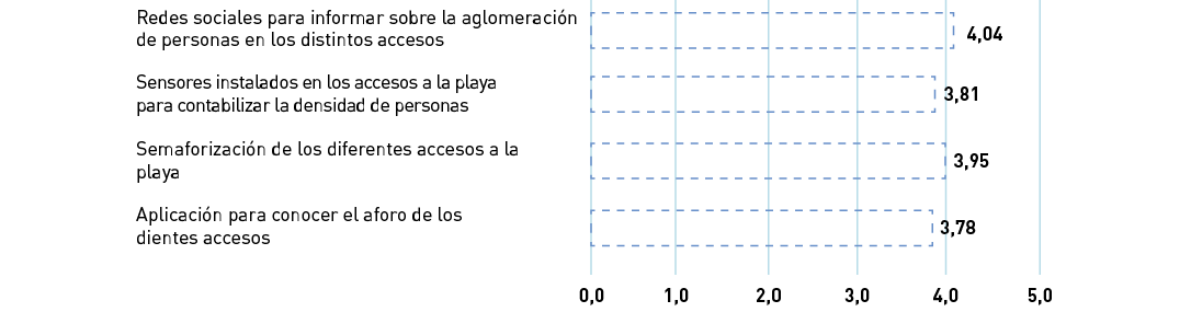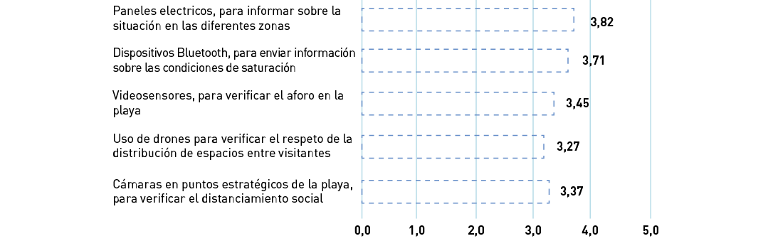 Por lo tanto, es recomendable la aplicación de la gestión inteligente de las playas del municipio de Rosarito, Baja California. Los visitantes regionales coinciden con la necesidad de tecnologías para lograr un control del aforo en las playas y tener disponible TIC que establezcan una comunicación dinámica de información y acceso a servicios del destino. El apoyo de tecnologías para mejorar los resultados de distanciamiento social tiene una buena aceptación por los visitantes encuestados.