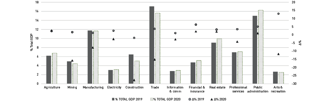 To control the pandemic, restaurants, hotels, educational institutions, and commerce in general have been closed. More than a year after the first strict con-finement was decreed, several restrictions remain. Therefore, the total GDP fell by 6.8% in 2020. The most affected economic sectors were construction; mining and quarrying; trade; and artistic, entertainment, and recreational activities with decreases in production of 27.7%, 15.7%, 15.1%, and 11.7%, respectively. In contrast, the financial sector grew 2.1% and the agricultural sector grew 2.8% (see Figure 1).