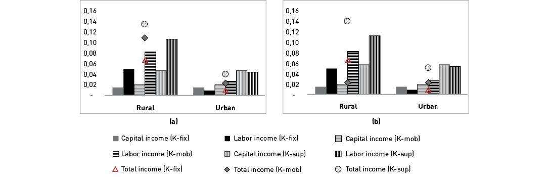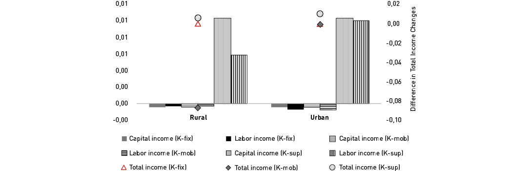 Table 1 shows the effects of different financing sources on some macroeconomic indicators for three capital options. When the capital is fixed (K-fix), tax-house and tax-fin have a positive impact on rural and urban consumption. Likewise, there is a positive impact on household disposable income, especially for rural households. Finally, there is also a growth in the GDP. Regarding the other two options (K-mob and K-sup), tax-house and tax-fin yield results similar to those found in the fixed capital option; they are higher due to greater flexibility, especially in the K-sup scenario.