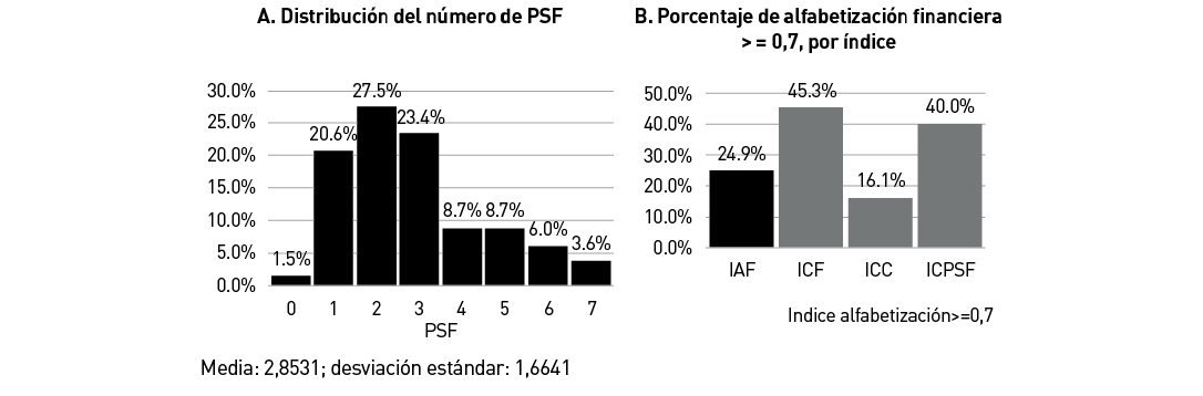 Finalmente, se obtiene una medida categórica denominada IAF_d, que se calcula de acuerdo con el puntaje obtenido para el IAF y los indicadores parciales. Según la literatura (Atkinson y Messy, 2012) y el criterio de contar con al menos un 25% de la muestra en cada tramo del indicador sintético, se establece que si la persona posee un IAF_d igual o mayor a 0,7 se encuentra alfabetizada financieramente, en cuyo caso se asigna 1, y en caso contrario 0, es decir, cuenta con baja alfabetización financiera. Este criterio es utilizado por Montaña y Ferrada (2021).
