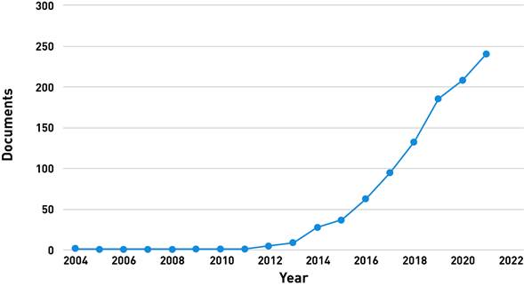 Los consumidores han modificado los hábitos de vida y de compra, lo que aumenta a su vez la costumbre de las compras en línea. Sin embargo, esto aún no es totalmente aceptado, lo que genera limitaciones para su desarrollo, planeación e implementación a nivel empresarial. Cada vez se incrementa más la intención de investigar y publicar en relación con la omnicanalidad, se aprecia un crecimiento casi exponencial en el número de publicaciones que contienen el término omnichannel o el término omnichannel (figura 2), en el título, el resumen o palabras clave de la base de datos de Scopus. A junio de 2021 se encontraron 882 referencias, mientras que a noviembre del mismo año se llegó a 1005, con uno de ambos términos. Esto muestra la tendencia creciente de publicaciones a través del tiempo, así como la cantidad de citaciones también creciente a noviembre de 2021.