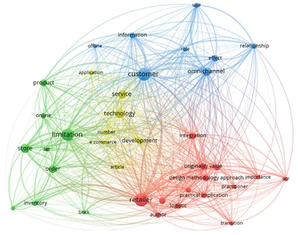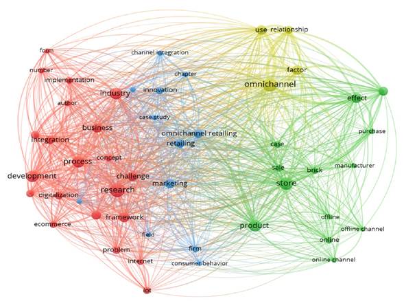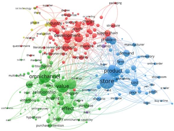 A partir de la búsqueda de artículos cuyo eje temático principal fuera la omnicanalidad, se elaboró un mapa de redes con los clústeres que crea el programa VosViewer, luego de asociar las frecuencias de términos temáticos. El mapa preliminar se resalta en la figura 3.