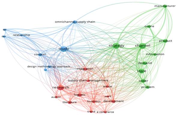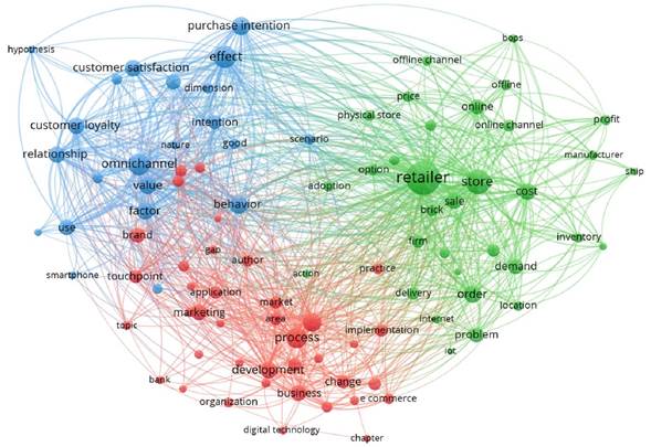 En el primer clúster (rojo), con 39 ítems, el marketing tiene un vínculo con alta fortaleza con respecto a la omnicanalidad, la marca, el reto, desarrollo, el distribuidor minorista y la lealtad de los clientes. El segundo clúster (verde) tiene 33 ítems, en el que el distribuidor minorista se lleva la mayor fortaleza de términos vinculados, por ejemplo, con respecto al marketing, estrategias omnicanal, tiendas. Por otro lado, el tercero (azul) tiene 22 ítems, entre los términos con mayor vínculo se encuentran intención de compra, la satisfacción y lealtad de los clientes, que a su vez se conectan con la estrategia de omnicanalidad, distribuidor minorista, marketing, marca, calidad, comportamiento y relaciones, términos altamente relacionados con los modelos de marketing omnicanal.