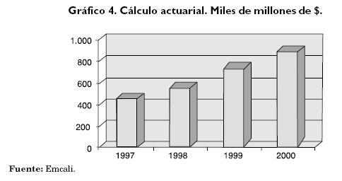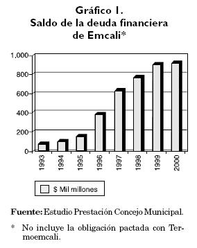 La deuda financiera en Emcali supera los 960 mil millones de pesos; como se puede observar en el gráfico 1, el monto empezó a dispararse a partir de 1996, cuando aumentó 154% respecto al año anterior. A finales del año 2000 el nivel de la deuda era 131% superior al de 1996. En efecto, la mayoría de los contratos actuales de deuda fueron firmados entre 1996 y 1998.