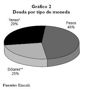 De otra parte, aunque Emcali solamente ha celebrado un contrato de deuda denominado en yenes, frente a ocho contratos en dólares, el monto en pesos de la deuda en yenes supera al monto en pesos de la deuda en dólares. Dentro de las propuestas para solucionar la crisis de la entidad, se encuentra la de renegociar la deuda en yenes, transformando el tipo de moneda.