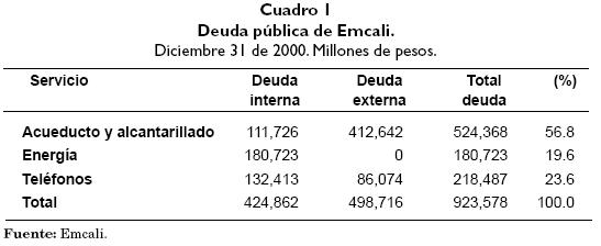 Emcali es una Empresa Industrial y Comercial del Estado, la principal entidad descentralizada del municipio de Cali; por esta razón el equipo de investigación del Observatorio Económico consideró pertinente dedicar una sección especial al análisis de la situación de esta empresa, que actualmente, y desde abril de 2000, se encuentra intervenida por la Superintendencia de Servicios Públicos Domiciliarios, por lo cual debe resolver antes de abril del año 2002 los problemas financieros que amenazan la viabilidad en su actividad económica, consistente en la prestación de los servicios de acueducto, alcantarillado, energía y telecomunicaciones.