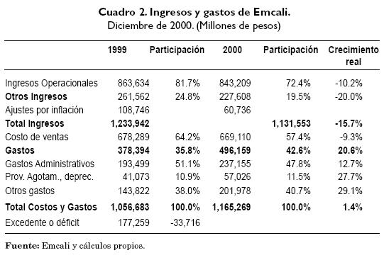 Por otra parte, el resultado del ejercicio para Emcali en diciembre de 2000 fue negativo, debido al impacto del déficit presentado en el negocio de energía.
