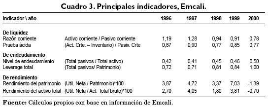 Adicionalmente, a partir del balance y del estado de gestión, es posible calcular una serie de indicadores que dan cuenta de la situación de liquidez, endeudamiento y rendimiento de la empresa. El Cuadro 3 muestra los resultados para el período 1996 - 2000.