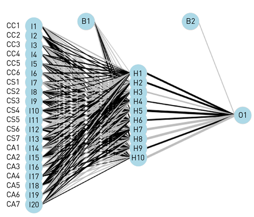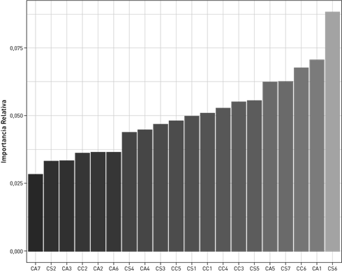 Los valores de alfa de la tabla A4 permiten afirmar la confiabilidad del instrumento aplicado. Sin embargo, la no normalidad de los datos indica que no es posible tratarlos apropiadamente por medio de estadística paramétrica; por esta razón, es adecuado analizar la importancia de cada variable usando una técnica más robusta, como las redes neuronales artificiales.