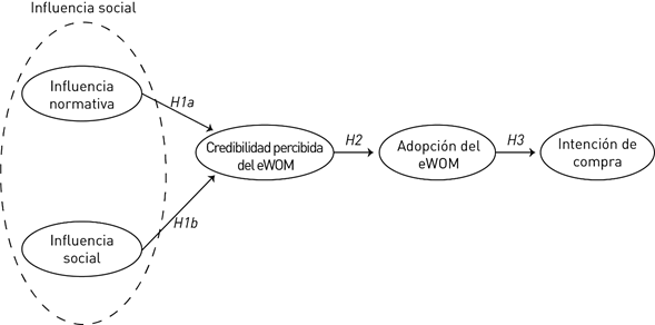 También se ha demostrado que la adopción de la información influye en el comportamiento del individuo (Hsu et al., 2016). En redes sociales, la adopción del eWOM tendrá efectos positivos o negativos en el consumidor (Erkan y Evans, 2016) y repercutirá, por tanto, en su comportamiento. Dabholkar y Sheng (2012) demostraron que la intención de compra es proporcional a la confianza generada por el emisor del mensaje en comunidades virtuales. Por otro lado, el estudio de Hsu (2021) aplicado a la industria cosmética de Asia reveló que las reseñas en línea influyen positivamente en las compras también en línea. Según estos resultados, se supone que la adopción de los mensajes de eWOM influyen de forma notable en la intención de compra. Se plantea así la última hipótesis de investigación (figura 1):