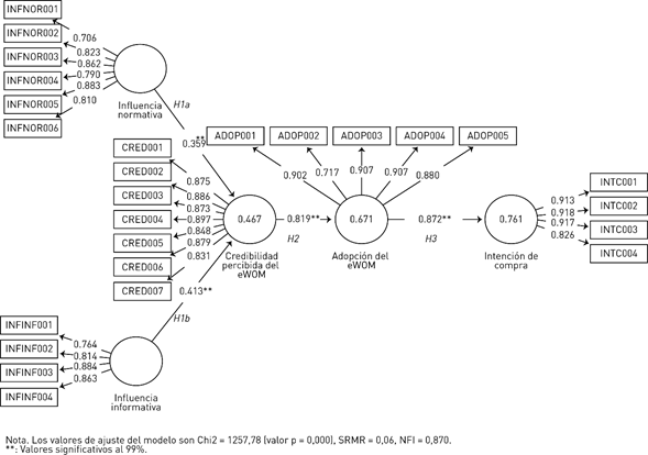 Por su parte, la credibilidad percibida del eWOM tiene una influencia positiva significativa en la adopción del eWOM (valor del coeficiente beta = 0,819; valor t = 39,44 > 1,96; valor p = 0,000 < 0,05) (tabla 4). El coeficiente beta muestra que un cambio de una unidad en la credibilidad percibida supone un cambio de 0,819 unidades en la adopción del eWOM, con ello se confirma la H2. En esta línea, estudios anteriores han demostrado que la credibilidad del eWOM conformada por la credibilidad de la fuente y confianza de la información repercuten en la adopción del eWOM (Cheung, 2014). Asimismo, el estudio de Fang (2014) , centrado en el modelo estímulo-organismo-respuesta, expone cómo la credibilidad percibida del eWOM constituye la base cognitiva que conduce a una respuesta, en este caso, la adopción del eWOM.