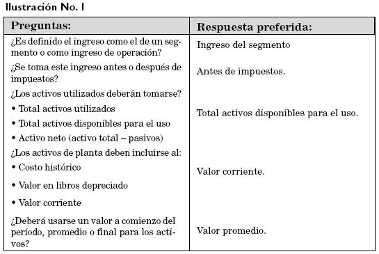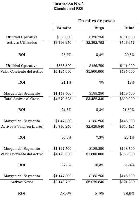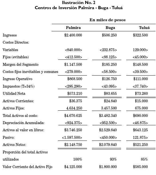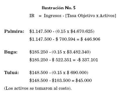 Continuando con el ejemplo previo, el IR es calculado para cada centro de inversión. La gerencia de la compañía ha establecido un 15% como tasa objetivo de retorno sobre los activos y ha definido la utilidad como el margen de utilidad del segmento. Los cálculos son mostrados en la ilustración No. 5. Los centros de inversión de Palmira y Tuluá muestran IR, positivos, lo que indica que estos centros de responsabilidad están obteniendo ganancias por encima de lo que la gerencia considera un cargo razonable por los fondos usados. El cálculo del IR para el centro de inversiones de Buga está significativamente por debajo con relación a los activos invertidos. La gerencia de este centro deberá analizar las causas de esta situación y corregirla de inmediato.