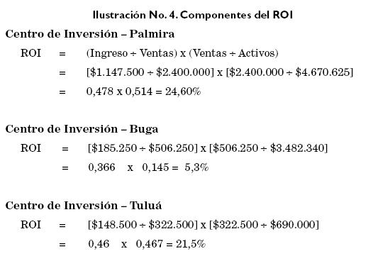 El Retorno sobre la Inversión, ROI: Es una razón que relaciona el ingreso generado por un centro de inversión a los recursos (o base de activos) usados para generar ese ingreso. La fórmula usada es: