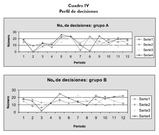 La segunda parte del programa de simulación o de "definición de la estrategia" fue la que presentó las diferencias más grandes entre los jugadores. Aquí los participantes ya estaban familiarizados con el programa y sus reglas. Tenían suficiente información y retroalimentación que podían usar para corregir su estrategia y acciones, y así enfocarse en los mejores resultados. Mientras más decisiones tomaran para ajustarse y mantenerse en el "camino correcto", mejor. El grupo A2 fue el que más decisiones tomó en este período. Comparativamente los grupos A3 y A4, que después de todo (en total) terminaron en el último lugar, tomaron 20 decisiones menos, lo que marca una gran diferencia.