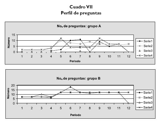 De nuevo, como en el caso de las decisiones, el número de preguntas formuladas depende de la etapa del programa en que se encuentren los participantes. Durante la orientación -primeros cuatro años- los estudiantes hicieron menos preguntas. Este período es un ensayo para ver y aprender cómo funciona el programa. Una vez se comprendan las rutinas básicas, los participantes comienzan a preguntar más, necesitan más información para tomar las decisiones correctas y obtener retroalimentación sobre el desempeño pasado. Aquí comenzaron a mostrar las mayores diferencias. Los buenos participantes diferían de los malos en la frecuencia en que examinaban su desempeño, y hacían más preguntas del estilo de por qué opuesto a preguntas qué (Dörner, 1995).