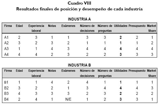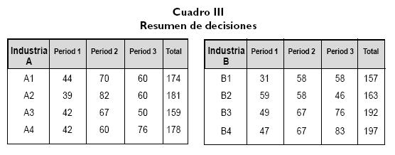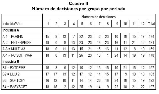 De los resultados obtenidos se puede concluir lo siguiente: el análisis de la Industria A permite comprobar nuestra hipótesis H1. El Grupo A2 tomó la mayoría de decisiones y obtuvo los mejores beneficios, mientras que el grupo A3, que tomó el mínimo de decisiones de toda la industria, terminó con los resultados más pobres (ver Cuadro I, donde figura la calificación final de cada grupo). En la primera parte solo hubo leves diferencias en el número de decisiones tomadas entre las organizaciones.