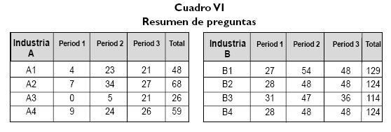 En total, nuestra hipótesis fue soportada en ambas industrias. La Industria A: el Grupo A2, que obtuvo los mejores beneficios, también fue el que hizo más preguntas durante el juego, y A3 que quedó de último tuvo el menor número de preguntas. Una mirada más detallada a la tabla demuestra que el efecto de las preguntas es más o menos el mismo en cada período. La reacción en la Industria B también dependió positivamente del número de preguntas formuladas. El Grupo B1 con el mayor número de preguntas terminó con los mejores beneficios y el grupo con el peor desempeño, B2, estuvo entre los que no hicieron muchas preguntas.