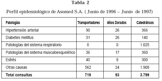 El perfil epidemiológico muestra que en el grupo de Transportadores S.A. la principal causa de consulta es la hipertensión arterial, seguida por la diabetes mellitus; en el grupo Años Dorados S.A. la lista de consulta la encabezan por igual la hipertensión y la diabetes; mientras que en el de los Catedráticos S.A. las afecciones del sistema respiratorio representan la principal causa de consulta, seguidas de lejos por la hipertensión arterial y las patologías del sistema musculoesquelético, el estrés, y por último la diabetes mellitus.