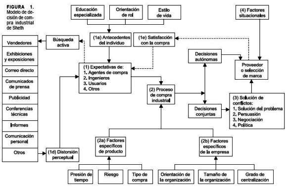 El modelo muestra que las diferencias en las expectativas de los compradores son causadas por: (1a) el entorno de los individuos; (1b) sus fuentes de información; (1c) la búsqueda activa; (1d) la distorsión perceptual; y (1e) la satisfacción con compras anteriores. Este modelo hace especial énfasis en la importancia que tiene el centro de compras como grupo de referencia dentro del proceso de decisión y las expectativas individuales de los participantes en la decisión. En la Figura 1 se puede observar dicho modelo.